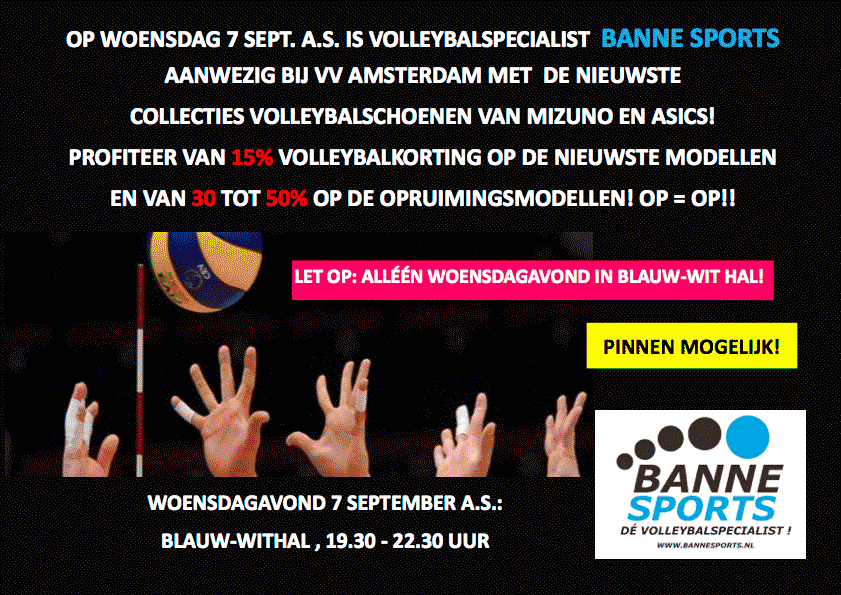 Banne Sports zal net als vorig jaar naar de hal komen voor de verkoop van nieuwe sportschoenen met 15% korting. Op woensdag 7 september tussen 19:30 en 22:30 uur is Banne Sports aanwezig in de Blauwwithal. Ben je deze dagen niet in de gelegenheid om naar de hal te gaan, dan kun je uiteraard ook naar de winkel, je krijgt dan 15% korting op schoenen en 10% op de overige volleybal artikelen.